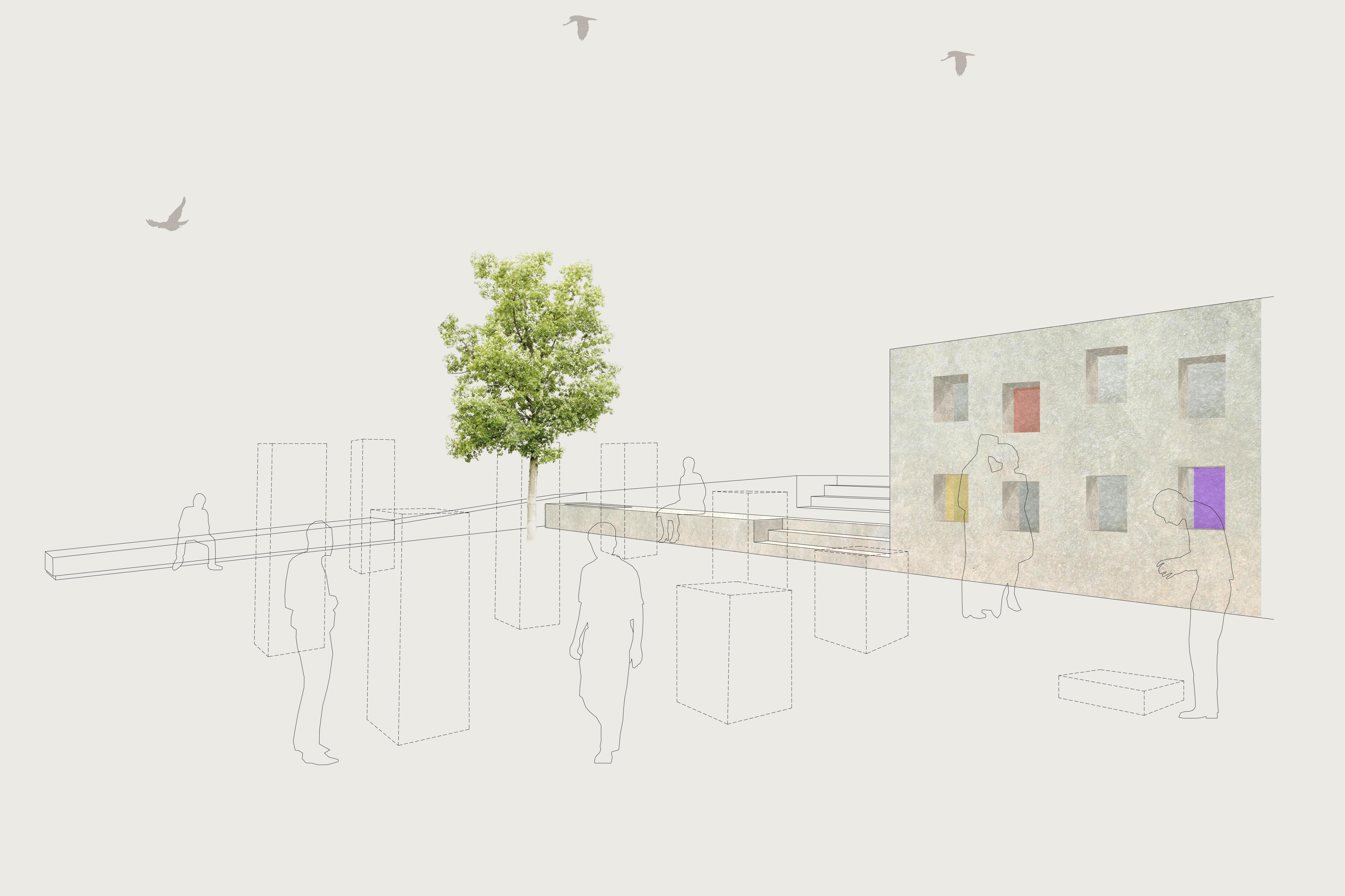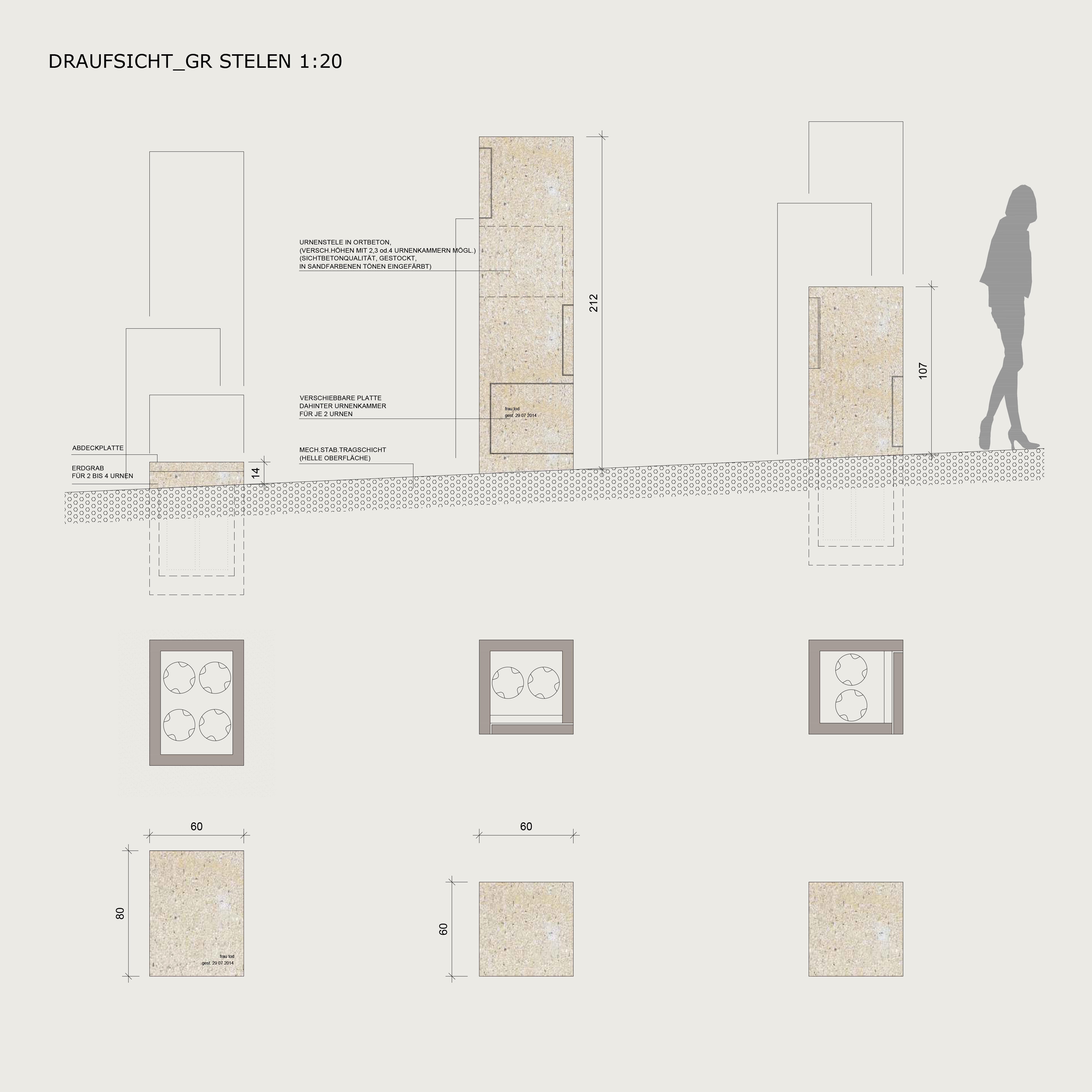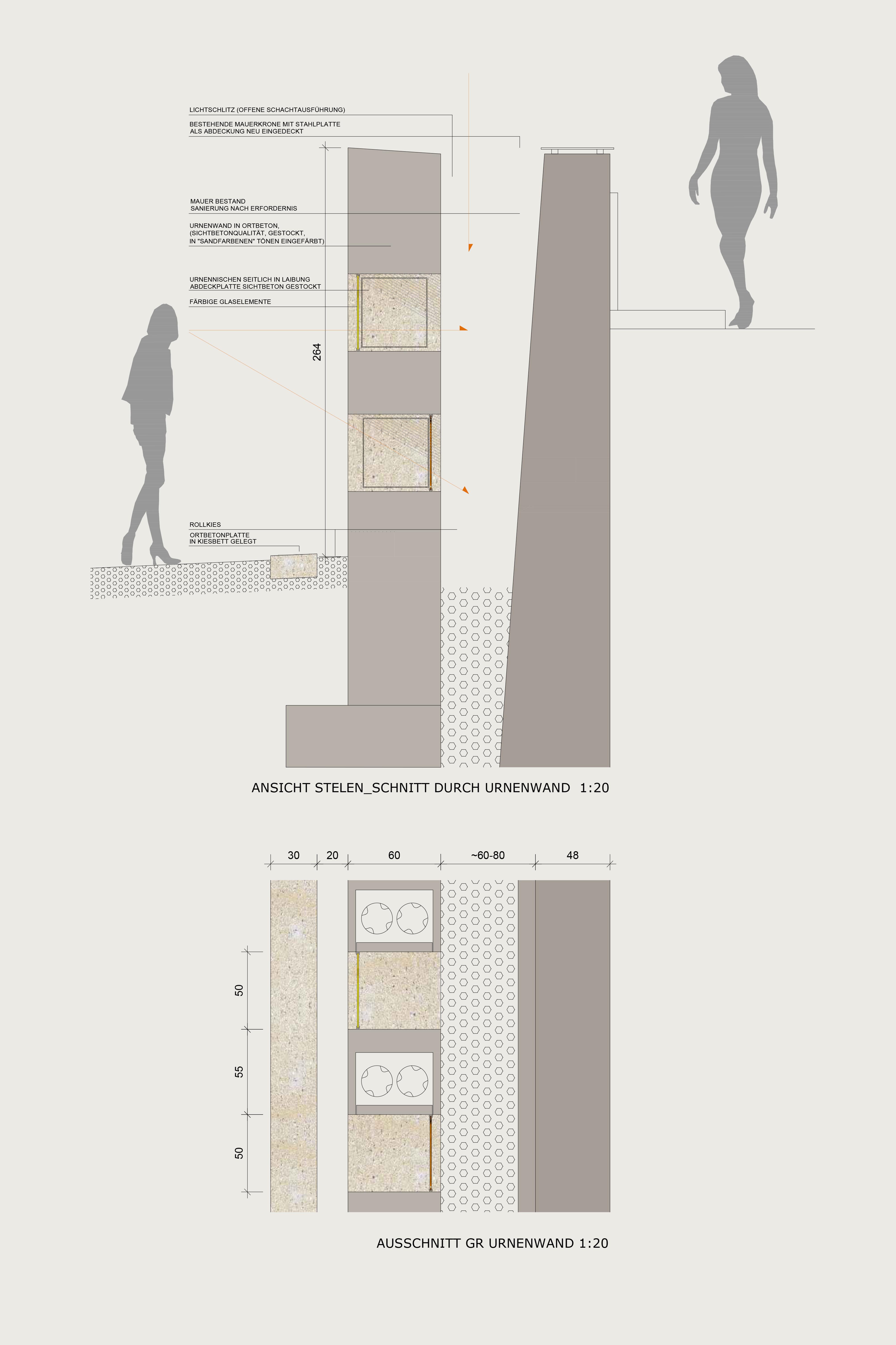 ‘‘Besonders überzeugt, abseits von gängigen Schematas, die Anordnung bzw. Lösung der Urnenbestattung. Eine prägende Urnenwand (freistehend von der alten bestehenden Friedhofsmauer) mit ‘Urnenfenstern’ und locker verteilten Urnenstelen erzeugen zusammen mit Sitzplatz, Baum und Brunnen einen poetischen Ort.’’