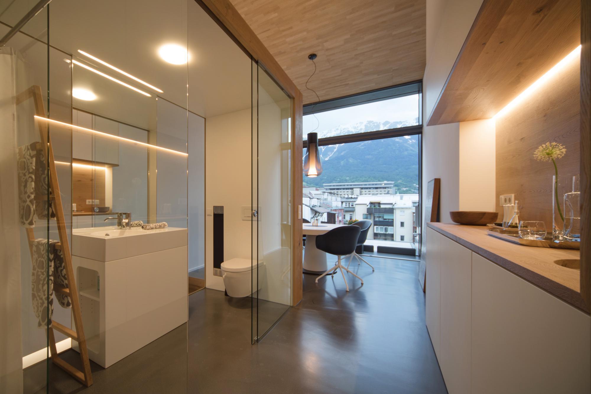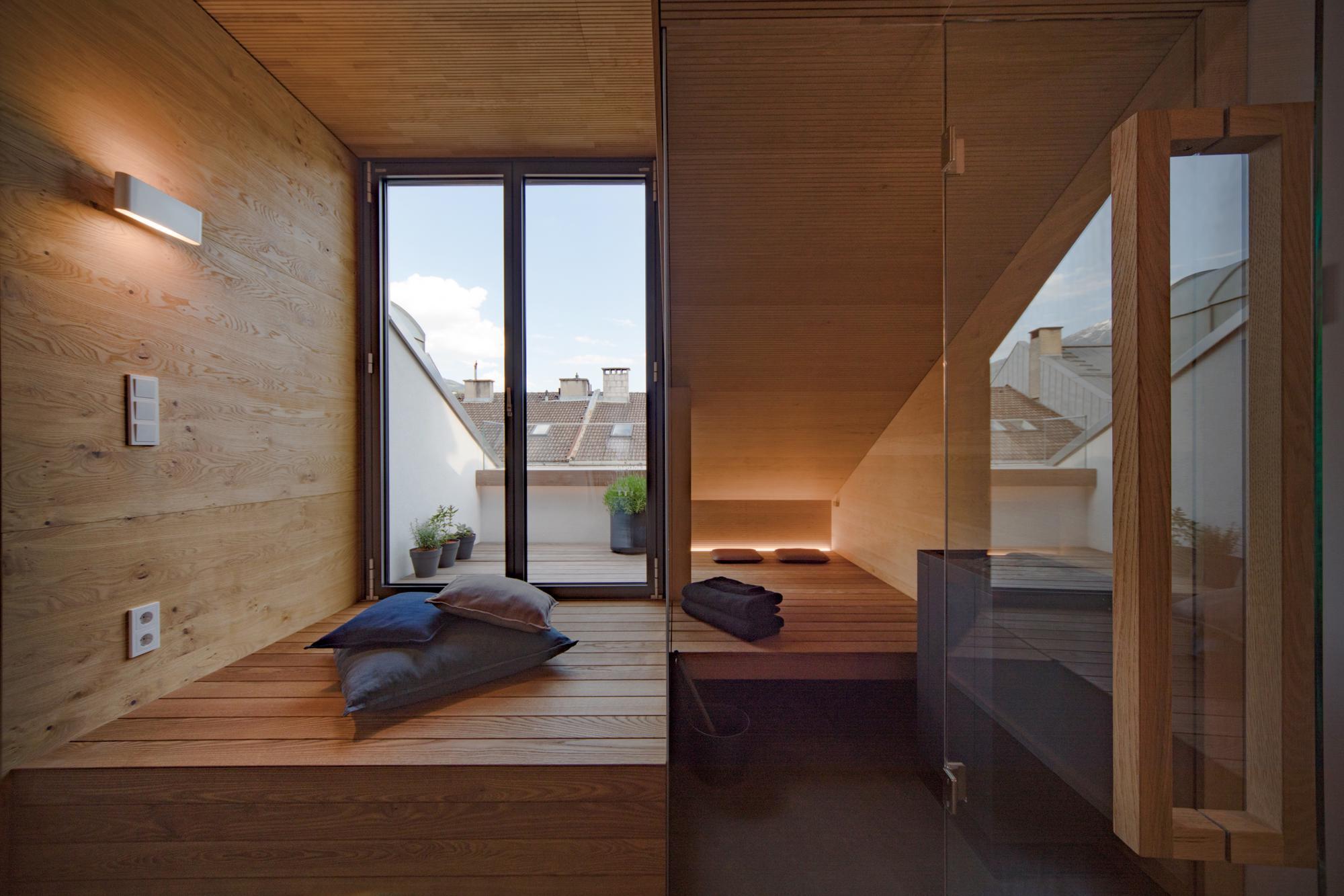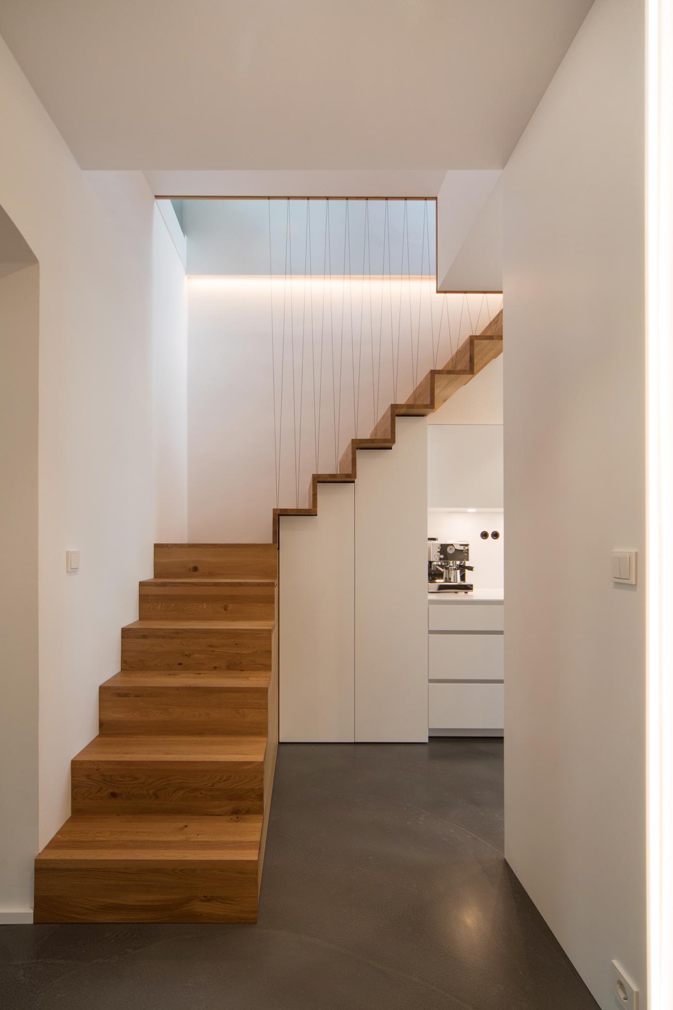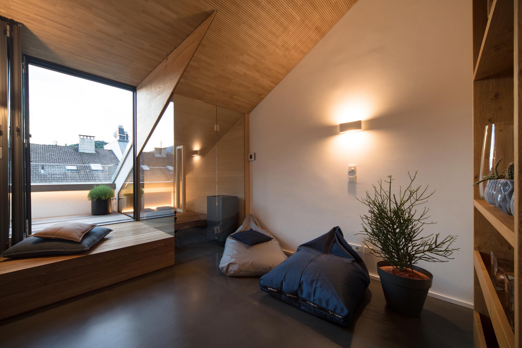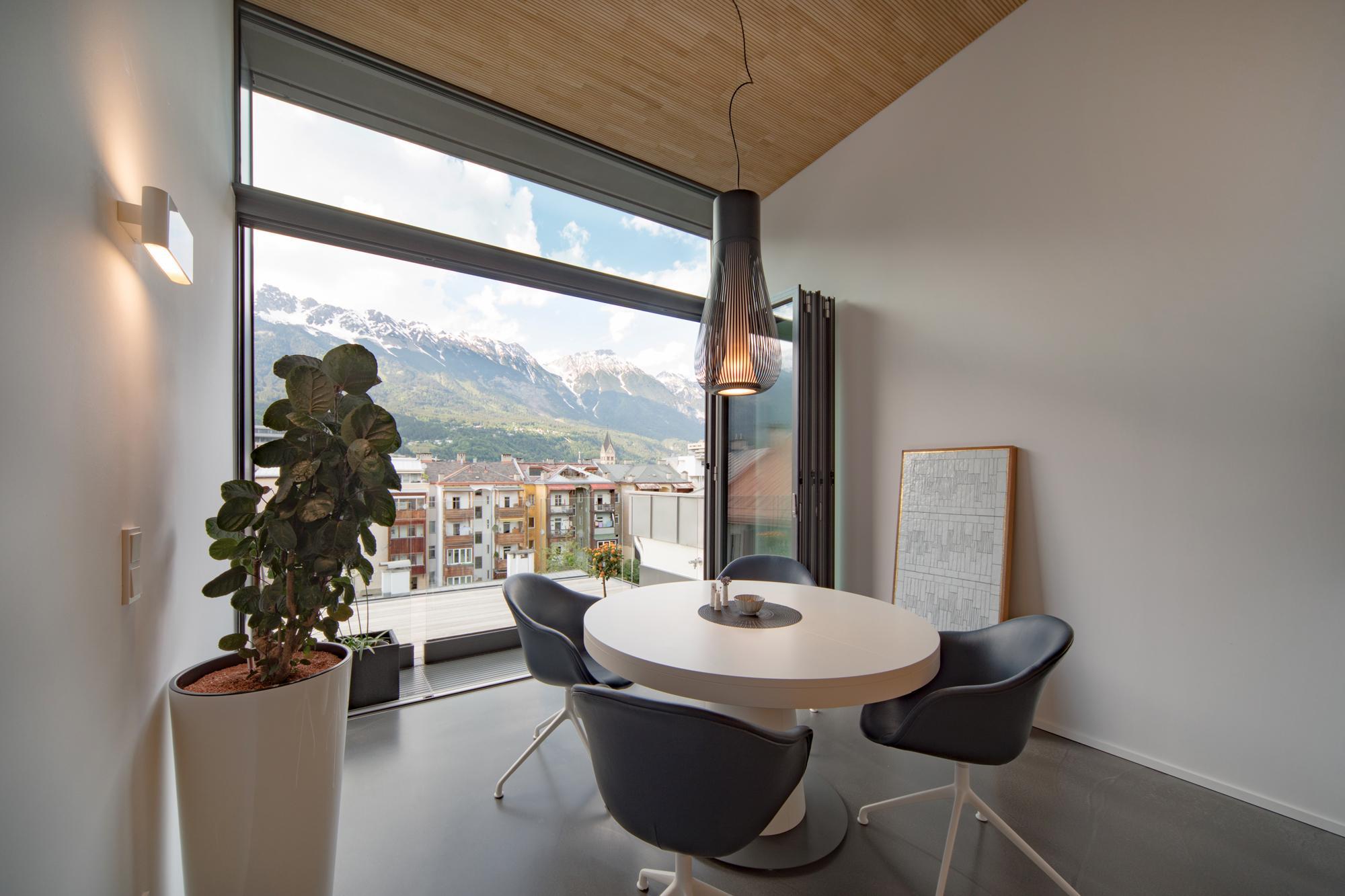 In einem gründerzeitlichen Mehrfamilienhaus wurde eine bestehende Dachgeschosswohnung mit der darunterliegenden Wohnung verbunden. Neben der Zusammenlegung und Neuorganisation der Wohnungen, wurde damit auch der Zusatznutzen einer kleinen Terrasse mit Blick auf die Berge ermöglicht.